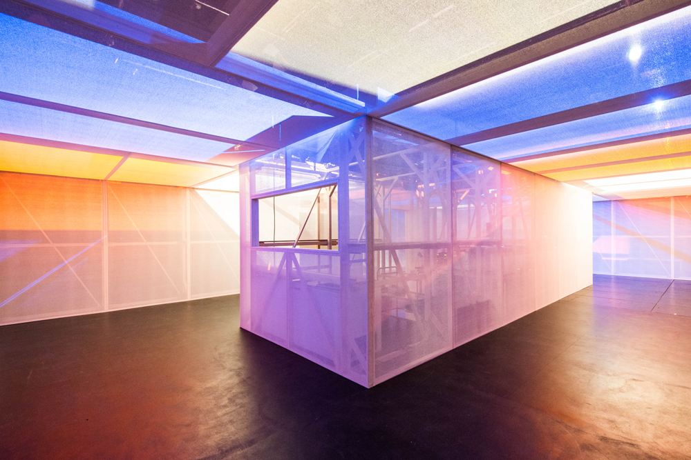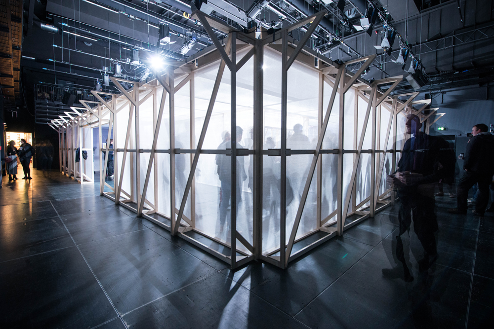 Im Januar 2018 entwickelten wir eine neue Arbeit für den Mousonturm. Nach der Messerschmiede (April 2017) war es die zweite Arbeit, die wir extra für den Theaterbau schufen. Dieses Mal besetzten wir das Herzstück des Künstlerhauses, den Theatersaal. Verstärkt wurden wir dabei durch die Kollektive HardWorkSoftDrink und Hotel International, die für die passenden musikalischen Line Ups sorgten. Wir bauten ein Hybrid zwischen Skulptur und Club, die die Blackbox in einen außergewöhnlichen Erfahrungsraum verwandelten. In ihm legten sich die Konventionen und Potentiale unterschiedlicher Raumdispositive übereinander. Innen- und Außenraum, glatte Fassade und offengelegte Konstruktionen, die individuelle Betrachtung eines Objekts im Ausstellungsraum, das kollektive Erleben im Theater und das Abtauchen in einer anonymen Masse im Club. Zu den DJ Sets von Max Vaahs, Cedric Dekowski, Felix Reifenberg, Thilo Dietrichs, Elena Colombi, Vincent Feit und Kilian Paterson verwandelte die Skulptur „Insight Out“ den Mousonturm für zwei Nächte radikal und lud die Besucher*innen ein, die eigene Position und Perspektive ständig zu wechseln.