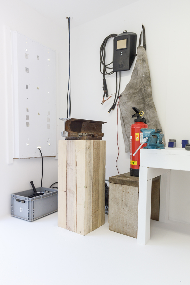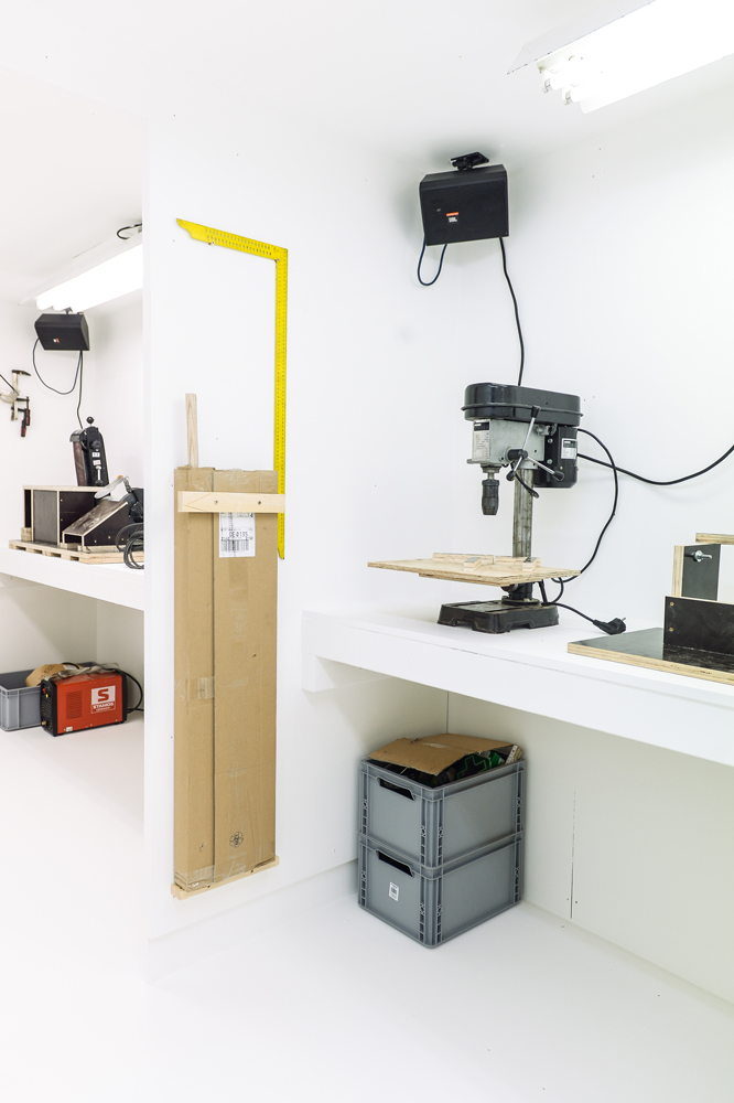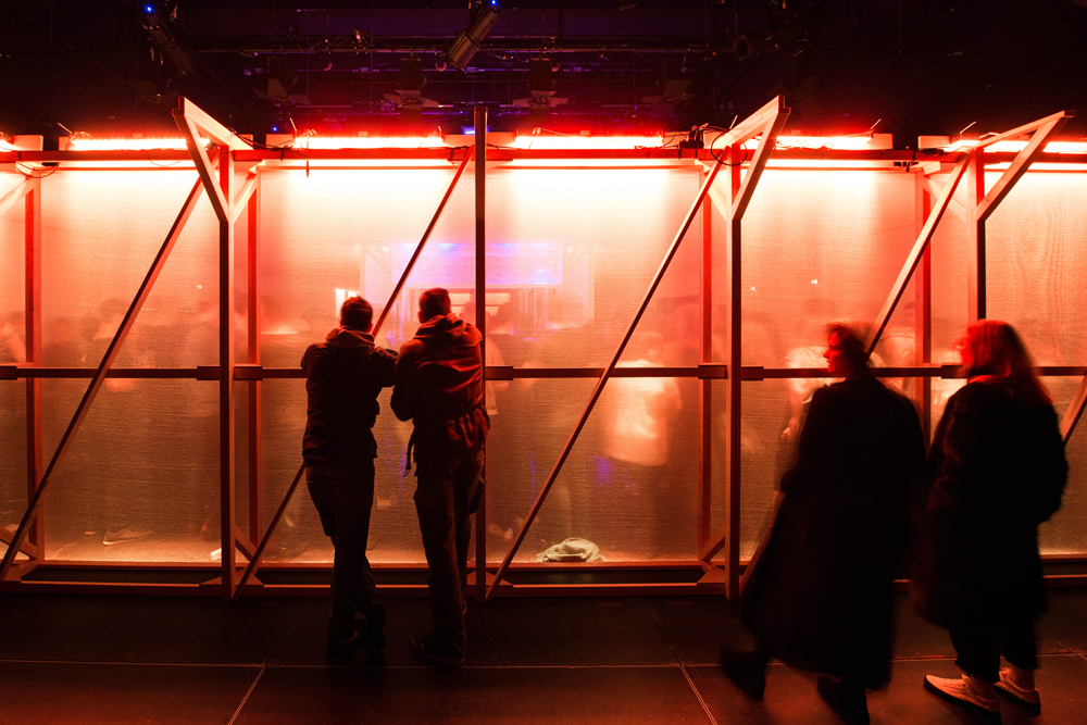 In January 2018, we developed a new sculpture for Mousonturm, making it the second piece we specially created of the theatre after “Messerschmiede” in April 2017. This time, we occupied the heart of the artist house: the theatre hall. Musically reinforced by the collectives HardWorkSoftDrink and Hotel International who were in charge of the line ups, we created a hybrid between sculpture and club which transformed the black box into an unusual space. Conventions and potentials of different spatial devices overlapped. Interior and exterior spaces, the smooth facade and the exposed structures, the individual contemplation of an object in an exhibition space, the collective experience of the theatre and the act of submerging oneself in the anonymous mass of the club. While Max Vaahs, Cedric Dekowski, Felix Reifenberg, Thilo Dietrichs, Elena Colombi, Vincent Feit and Kilian Paterson were playing DJ Sets the sculpture “Insight Out” transformed the Mousonturm-Saal radically for two nights and invited visitors to constantly shift positions and perspectives.