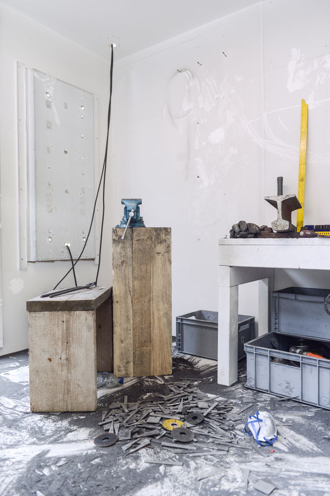 From April 7th to April 21st 2017, we opened a knife factory at Künstlerhaus Mousonturm as our first project in the context of the Doppelpass collaboration. The factory, a wooden construction with four chambers, worked its way into the Mousonturm’s restaurant and occupied it like a parasite. We were driven by the challenge and desire to develop a universally usable product rather than by the display of manual skills. That is why, three quarters of the knife factory were not visible and only the showroom was accessible. Nevertheless, the production process was present as a noisy sound installation and achieved to create interesting tensions and irritations for restaurant guests.