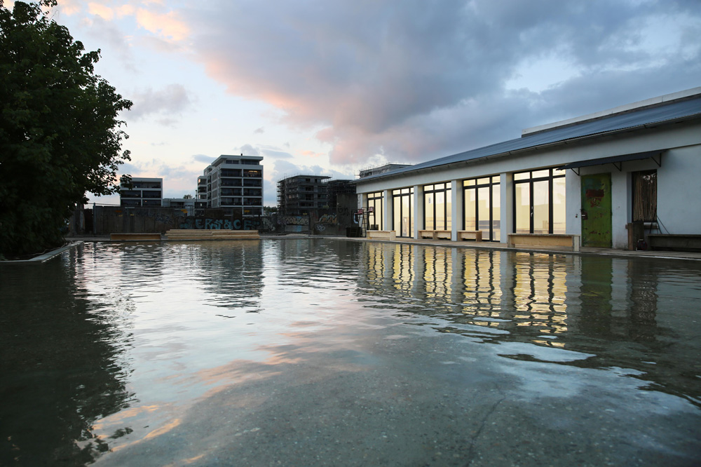 We flooded the yard in front of the Kressmann-Halle, our exhibition space since June 2016. To do so, we built a concrete wall around the lot and filled the basin with 180,000 litre of water. A construction error of a new adjacent street, leading to regular floodings of our property, had inspired us. We were interested in the ambivalence between the creative character of a city fountain and the destructive power of floods.