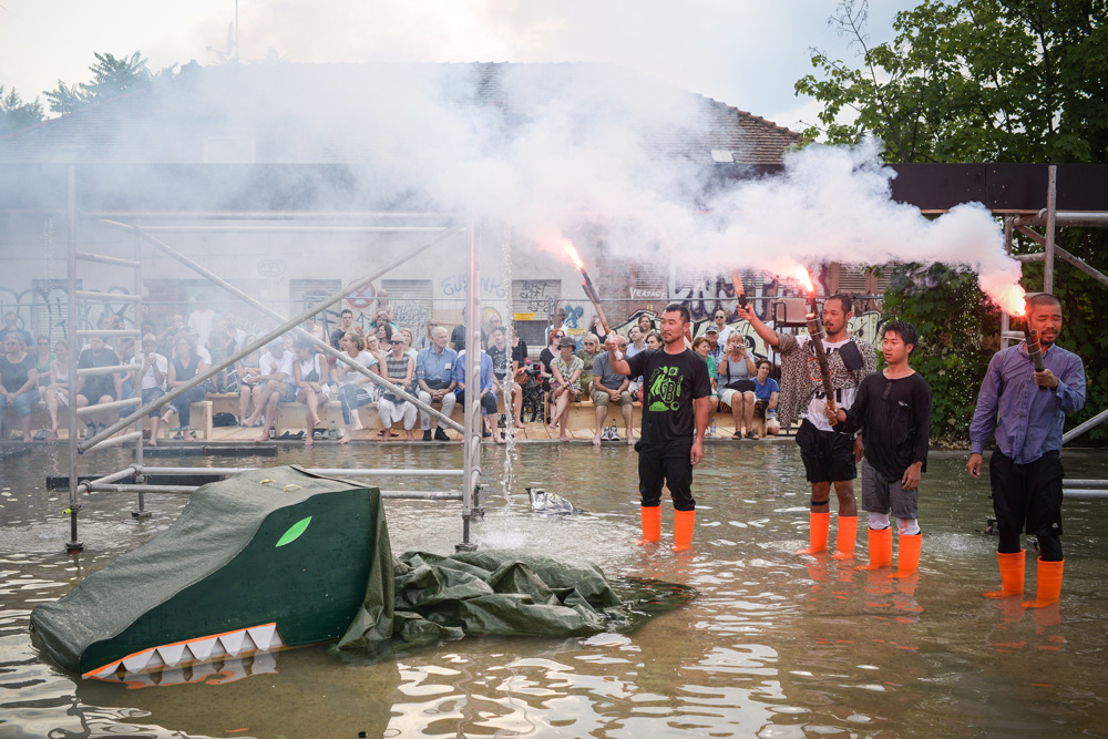Der geschaffene See war Wasserbecken, begehbare Skulptur und Bühne zugleich. Während der Seefestspiele bespielten wir ihn an jedem Tag mit einer anderen performativen Aktion. Unsere künstlerischen Komplizen waren dabei das Frankfurter Musik-Duo Les Trucs – bekannt für Experimente mit elektronischen Gerätschaften und akustischen Ready Mades – und das in Osaka beheimatete Kollektiv contact Gonzo, das mit seinen halsbrecherisch-verspielten Performances die Kunstwelt von New York bis Tokio erobert hat.