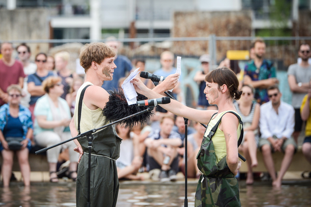Eine Brache, eine Pfütze, Beton, Holz, vier Wochen Vorbereitungszeit und neun Künstlerinnen und Künstler – das waren die Ausgangselemente für die 1. Offenbacher Seefestspiele mit der die Doppelpass-Partnerschaft zwischen dem Künstlerhaus Mousonturm und uns in die zweite Runde ging.