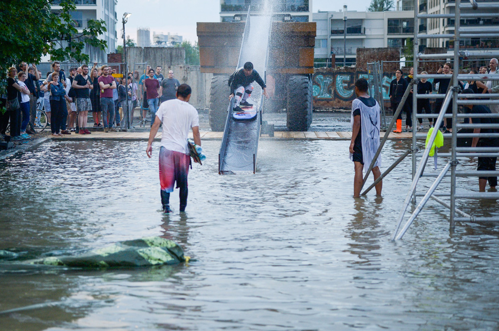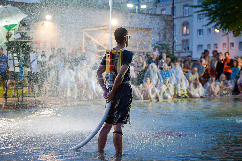 We transformed the scenery overnight. The tower turned into several gates with water cascades. They served as a playfield for a new sport that was born on DAY 2 (Fri. 07.07.) In Offenbacher Cricket, contact Gonzo and 10 brave individuals from Offenbach and Frankfurt dived into the cold depths. Les Trucs provided the appropriate soundtrack, supported by DJ Rasenmäher.