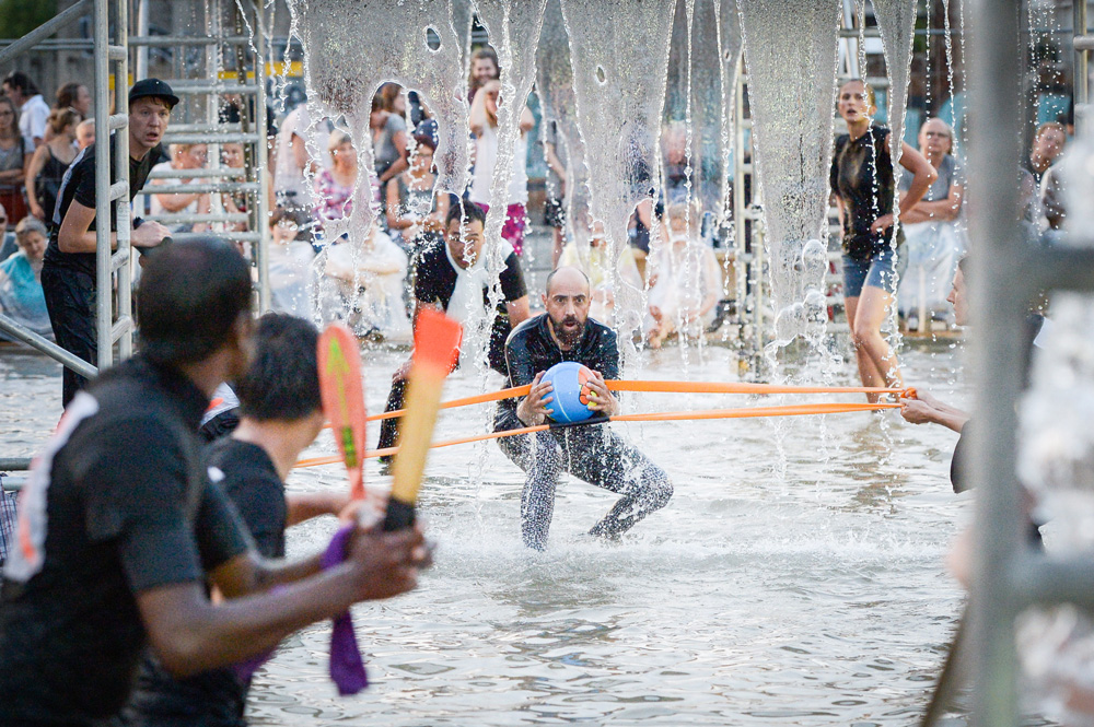 Über Nacht verwandelten wir die Szenerie. Aus dem Turm wurden mehrere Tore mit Wasserkaskaden. Sie bildeten das Spielfeld für eine neue Sportart, die im Rahmen von TAG 2 (Fr. 07.07.) der Seefestspiele geboren wurde. Beim Offenbacher Cricket stürzten sich contact Gonzo und zehn unerschrockene Menschen aus Offenbach und Frankfurt ins kalte Nass. Für den passenden Sound sorgten Les Trucs und DJ Rasenmäher.